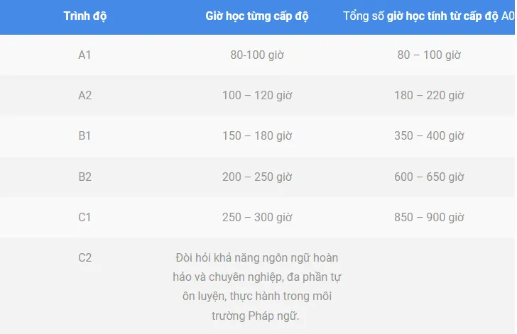 Lưu ý : Đây chỉ là số giờ trung bình được tính toán của khung tham chiếu chuẩn Châu Âu, giờ học thực tế sẽ dựa trên khả năng tiếp thu, động lực và sự nghiêm túc của học viên khi học.